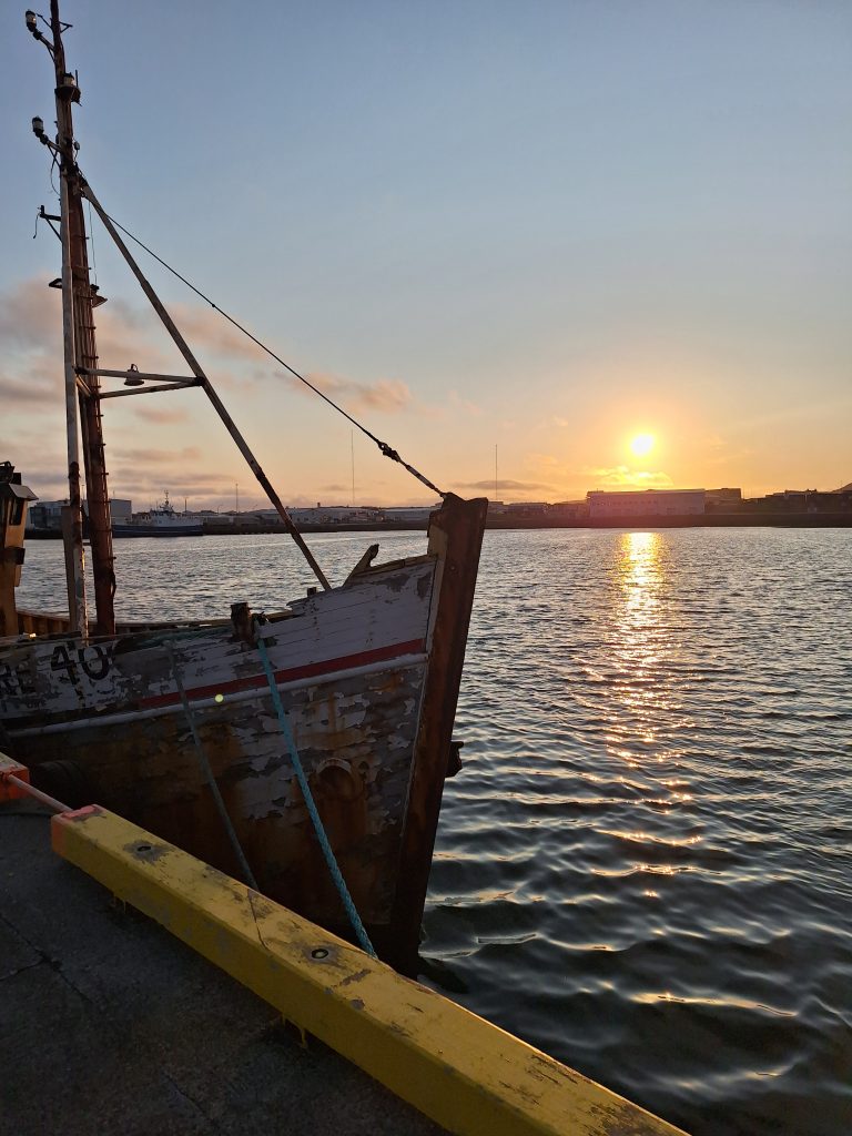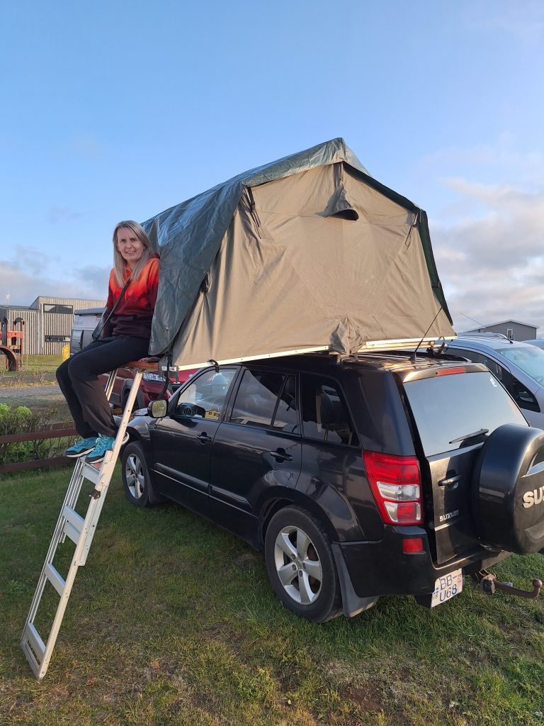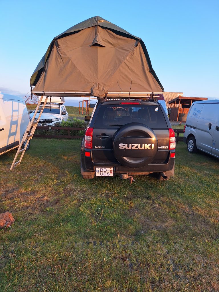 Przylecieliśmy popołudniem, odbiór samochodu od Polaka, wraz z namiotem dachowym. Pierwsze zakupy spożywcze w Bonusie i ruszyliśmy na camping. Już sama droga ze stolicy do Grindavík była interesująca, jechaliśmy wśród zastygłej lawy, która jeszcze nie dawno zniszczyła część tej drogi. Minęliśmy też po drodze sławną Błękitną Laguną. Zameldowaliśmy się na kempingu, który był ok, … ale też bez zachwytu, kuchnia mała, trzeba mieć własne sztućce i talerze. Widok na port. I przyszedł czas na pierwszą noc pod namiotem dachowym. Długo jej nie zapomnę … zmarzłam, że…, ale na następne noce już wiedziałam jak się ubrać i nie było już tak źle, pod koniec nawet się przyzwyczaiłam i przesypiałam te 8 godzin, ale po pierwszej nocy myślałam czy nie spać w środku samochodu, tam przynajmniej byłoby cieplej.