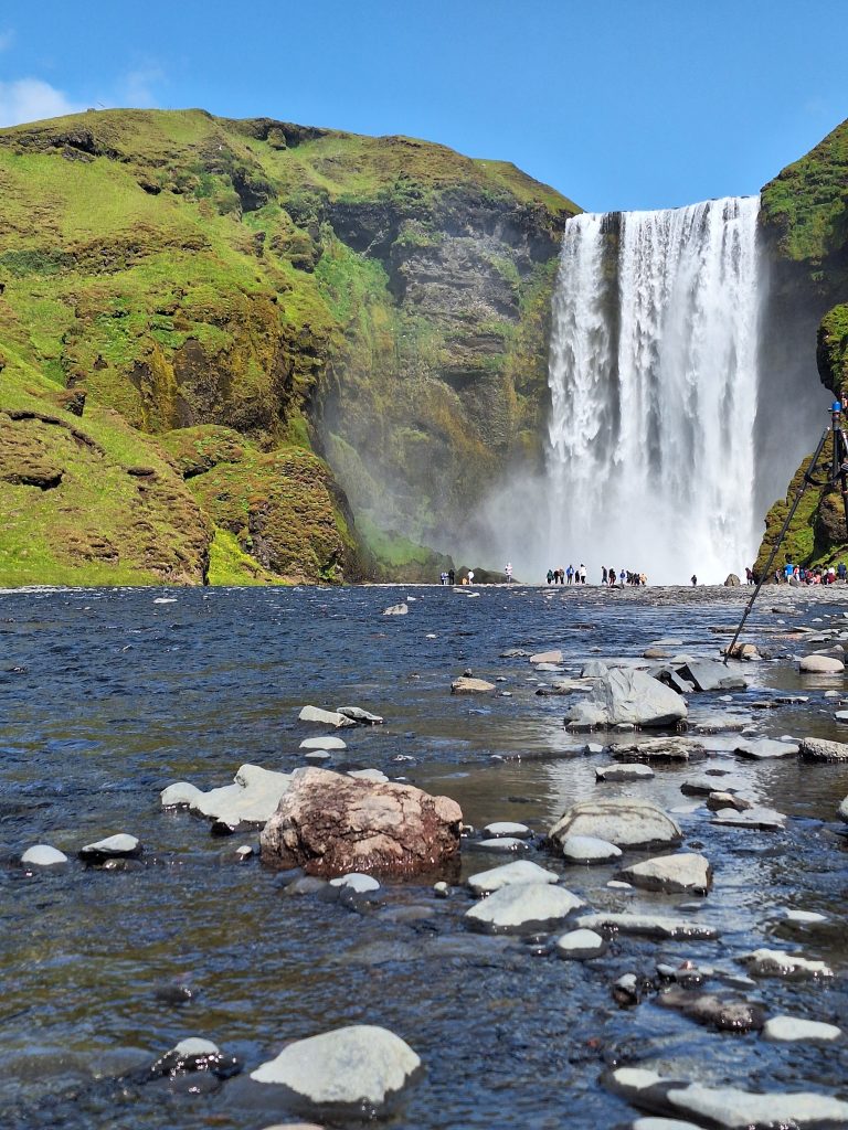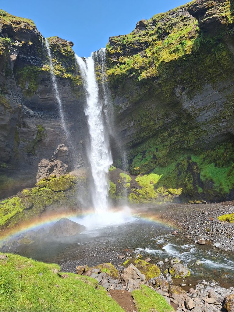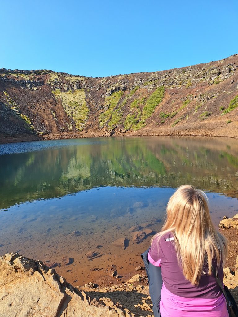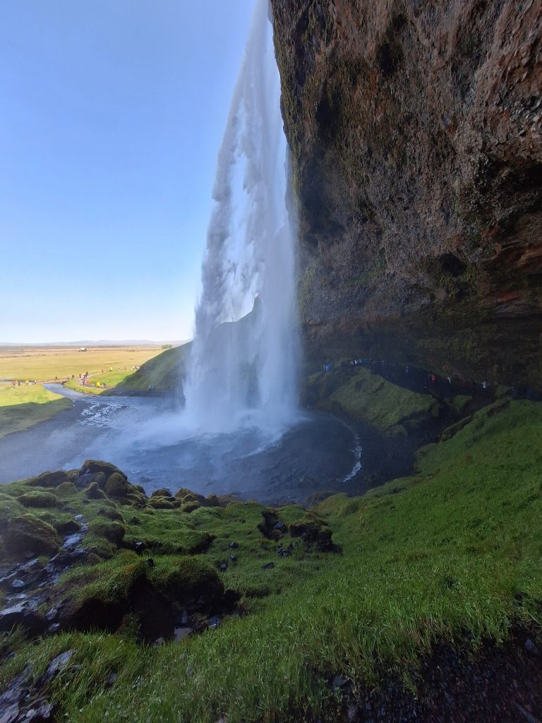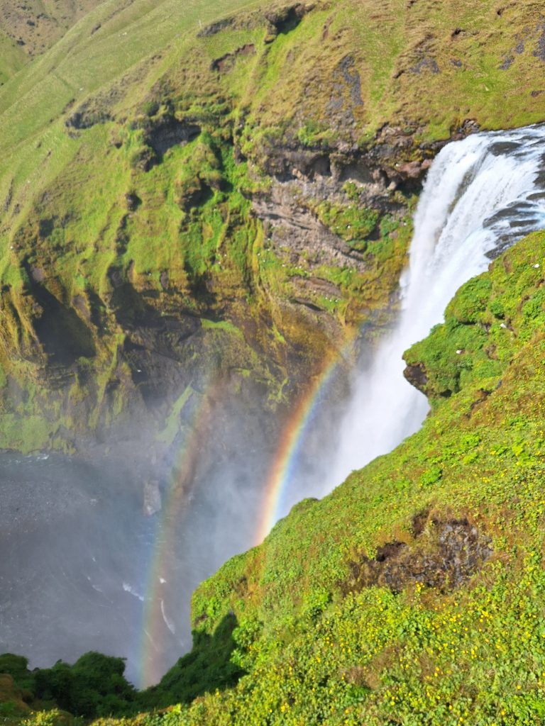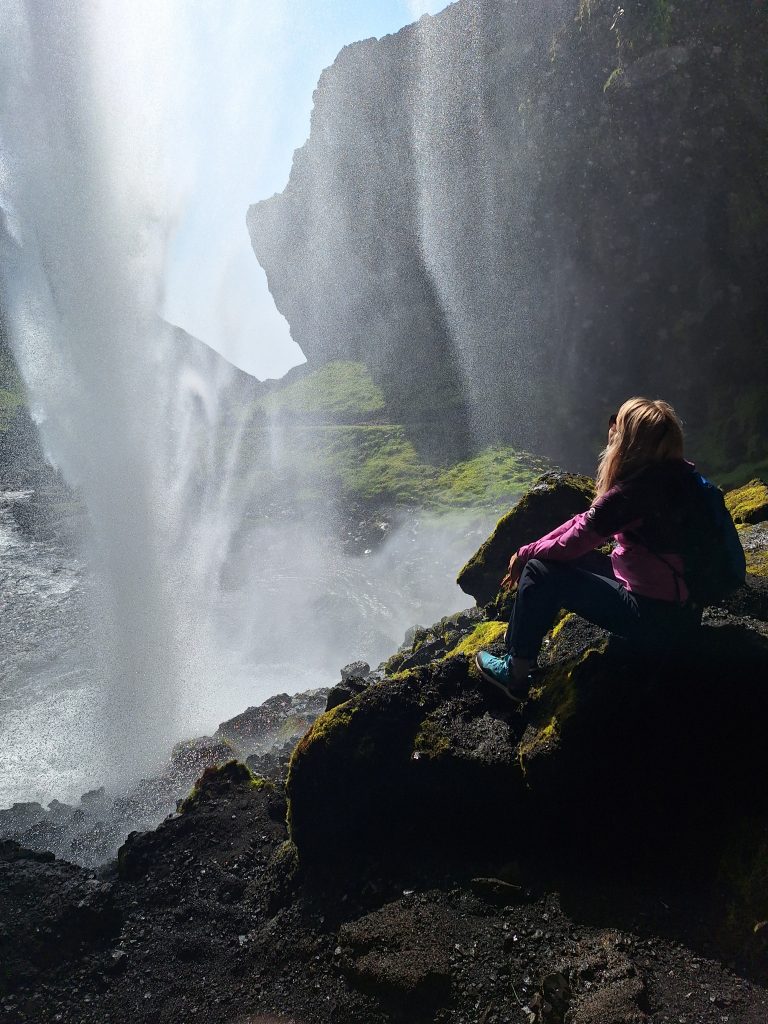 Wyruszyliśmy z Grindavík Campsite, naszym pierwszym przystankiem był Kerid to kraterowe jezioro wulkaniczne położone w rejonie Grímsnes w południowej Islandii. Znajduje się w pobliżu Reykjaviku – przy drodze 35, ok. 13 km na północ od miasteczka Selfoss. Krater można okrążyć bezpieczną ścieżką, a następnie zejść na dół i podziwiać nieskazitelne czyste jeziorko kraterowe. Kolejnym przystankiem był Seljalandsfoss – jeden z najbardziej znanych wodospadów Islandii. Ma około 60 metrów wysokości, a jego wyjątkowość polega na tym, że można obejść go dookoła. Spacer za kaskadą wody, w chmurze mgły i tęczy, to przeżycie, którego nie zapomina się nigdy. Zaledwie kilkaset metrów dalej znajduje się Gljúfrabúi, mniej znany, ale niezwykle klimatyczny wodospad ukryty w wąskiej skalnej szczelinie. Warto założyć nieprzemakalne buty i wejść do środka – widok w środku kanionu jest magiczny. Kolejnym przystankiem był wodospad Skógafoss monumentalny wodospad, którego huk słychać z daleka. Można podejść bardzo blisko lub wspiąć się po schodach na punkt widokowy na górze, skąd rozciąga się panorama rzeki Skóga i zielonych wzgórz. W jednym z przewodników przeczytałam, że zdjęcie Skogafoss można umieścić w encyklopedii jak idealne zdjęcie wodospadu. Niedaleko Skogafoss znajduje się Wodospad Kvernufoss to jeden z ukrytych skarbów Islandii — często pozostaje w cieniu swojego słynnego sąsiada, ale oferuje o wiele spokojniejsze i bardziej kameralne doświadczenie. Ukryty w wąskim wąwozie, wodospad spływa z gracją do porośniętego mchem kanionu, tworząc bajkową scenerię, która sprawia wrażenie miejsca odległego o całe światy od tłumów zaledwie kilka minut drogi stąd.