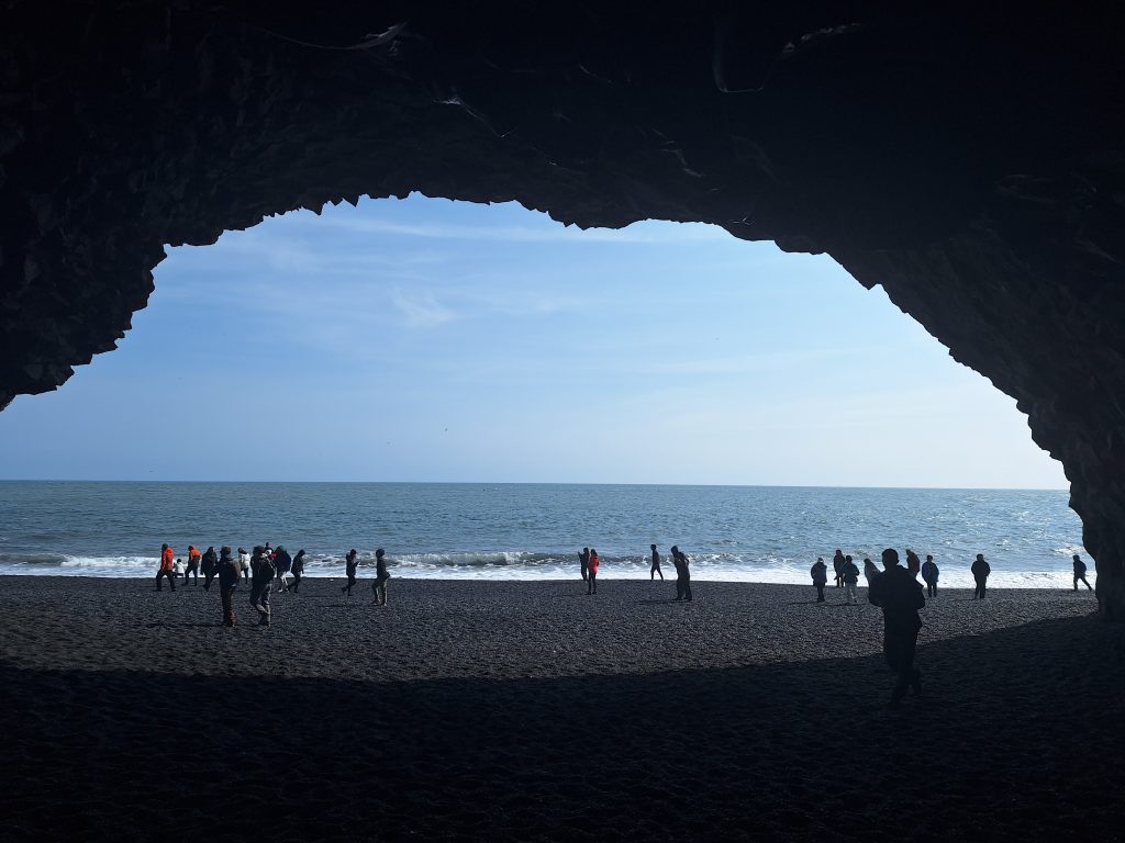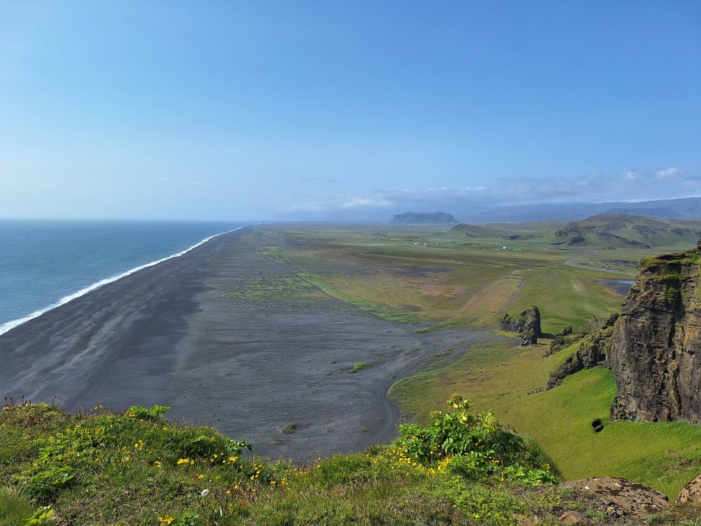 Naszym następnym przystankiem była latarnia Dyrhólaey i punkt widokowy Reynisfjara. Aby się do nich dostać należy zjechać z jedynki i drogą pod górę zaparkować na niewielkim parkingu. W tym miejscu oprócz pięknych widoków na czarną plażę, latarnię morską, skalny łuk zobaczyliśmy również puffiny, ptaka – symbolu Islandii. Ostatnim punktem przed noclegiem na campingu była Reynisfjara to jedna z najsłynniejszych i najbardziej niezwykłych plaż Islandii, położona w pobliżu miejscowości Vík í Mýrdal na południowym wybrzeżu wyspy. Jej charakterystyczną cechą jest czarny, wulkaniczny piasek, który tworzy niezwykły kontrast z białą pianą fal Atlantyku.