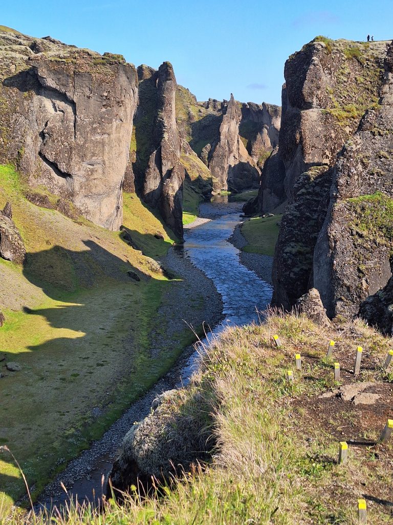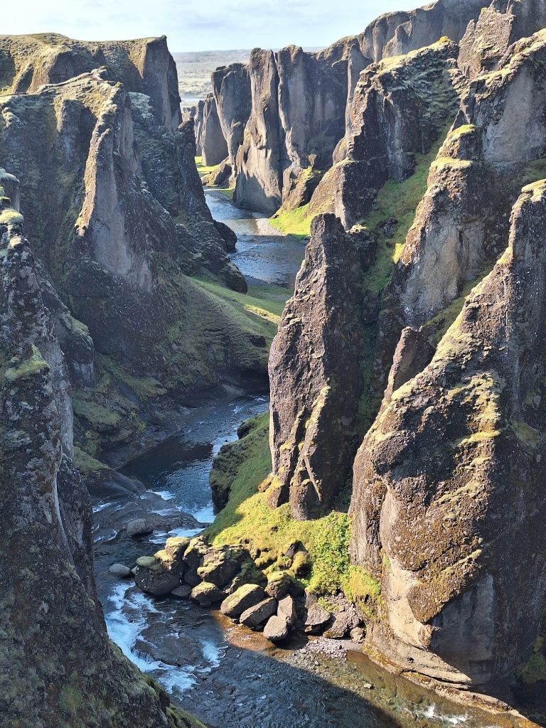 Pierwszym przystankiem po opuszczeniu Vik był kanion Fjaðrárgljúfur. Jest to Jeden z najbardziej zachwycających i fotogenicznych kanionów Islandii – kręty, porośnięty mchem cud natury, wyrzeźbiony przez rzekę Fjaðrá na przestrzeni tysięcy lat. Znajduje się niedaleko wioski Kirkjubæjarklaustur, a jego długość to około 2 kilometry, przy głębokości sięgającej 100 metrów. Wygląda wręcz nierealnie – jak sceneria z filmu fantasy (zresztą pojawił się w teledysku Justina Biebera “I’ll Show You”, który przyniósł mu światową sławę). Strome, porośnięte mchem ściany kanionu wiją się malowniczo, a w dole błyszczy wąska rzeka. Spacer wyznaczoną ścieżką wzdłuż krawędzi dostarcza niesamowitych widoków – z każdego punktu panorama wydaje się jeszcze piękniejsza. Najlepsze punkty obserwacyjne znajdują się na końcu szlaku, gdzie kanion otwiera się szerzej, a w oddali widać, jak rzeka spływa z islandzkich wyżyn.