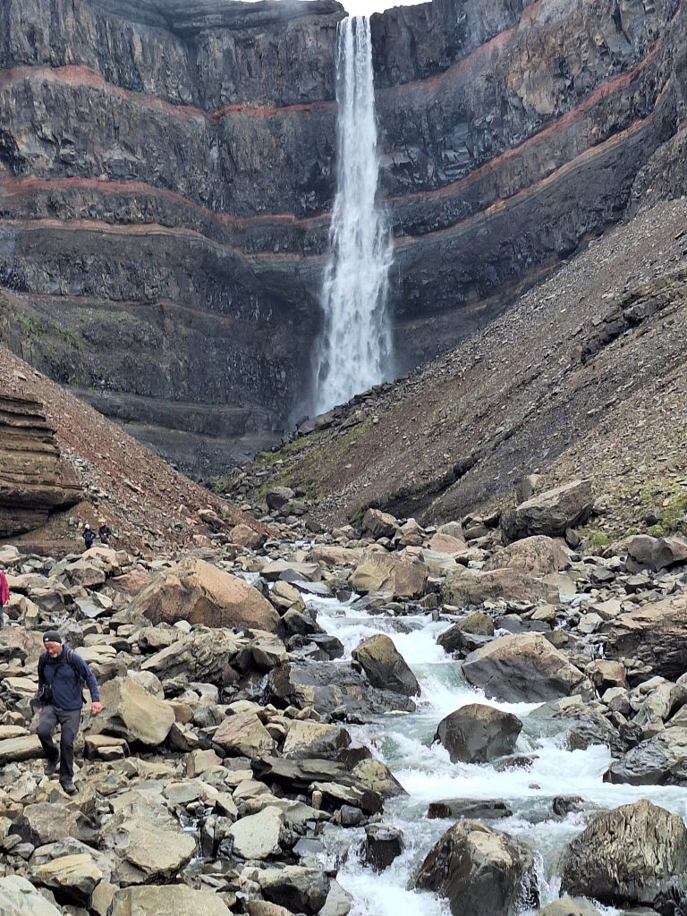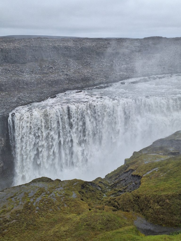 Na ten dzień mieliśmy zaplanowane najwięcej jazdy, bez uwzględniania zjeżdżania na atrakcje mieliśmy do pokonania 350 km, na północ Islandii w okolice jeziora Myvatan. Poranek nas przywitał tak jak wieczór … deszczem. Ale po około godzinie jazdy pogoda poprawiła się, a przynajmniej nie padało. Pierwszym naszym przystankiem był wodospad Hengifoss. Parking położony ok. 40 minut od wodospadu, a dokładnie od miejsca do którego dochodzi szlak. Później możemy dojść jeszcze po skałach pod sam wodospad. Początek trasy wygodny, po kraciastej ścieżce, ale im dalej tym bardziej wymagająco, a koniec jest lawirowaniem wśród kamieni blisko wodospadu.. Na wejściu mapa, która wskazuje, że jedną stroną wąwozu wchodzimy a drugą schodzimy. Przepiękne skały bazaltowe po drodze i mniejsze wodospady. Barwy poziomych przebarwień na słońcu – zjawiskowe. Kolejnym przystankiem był Stuðlagil Canyon i tutaj uwaga do wszystkich, którzy się tam wybierają, podobny błąd zrobili nasi znajomi, nie należy jechać do głównego wejścia, które wskazują gogle maps. Owszem będziemy przy kanionie, ale od tej strony rzeki nie ma możliwości zejścia na dół, jest tylko platforma widokowa. Aby zejść w dół trzeba było się sporo cofnąć, żeby znaleźć się po drugiej stronie rzeki. Widok oczywiście ładny, ale niepowalający, żałowaliśmy że znaleźliśmy się po tej niewłaściwej stronie rzeki, a na cofanie się nie mieliśmy za bardzo czasu. Ruszyliśmy dalej w stronę Myvatan. Naszym ostatnim przystankiem tego dnia przed kempingiem był wodospad Dettifoss, największy na Islandii i drugi co do wielkości w Europie. Dettifoss ma 100 metrów szerokości i spada z wysokości 44 metrów do głębokiego wąwozu rzeki Jökulsá á Fjöllum, niosącej wody z lodowca Vatnajökull. To właśnie ten lodowiec odpowiada za szaro-błękitny kolor wody, pełnej pyłu i osadów lodowcowych. Potęga żywiołu jest tu namacalna – ziemia drży, a drobne krople wody unoszą się w powietrzu, tworząc wieczną mgiełkę.