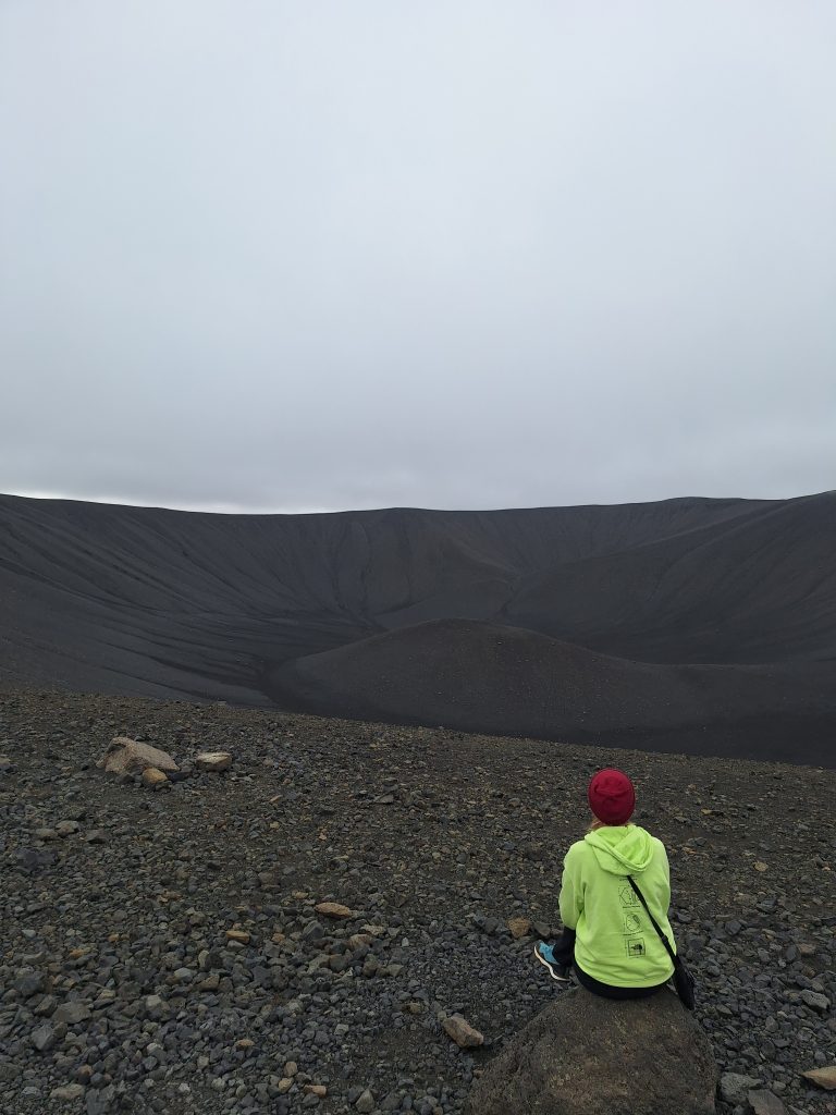To miejsce, gdzie ziemia dosłownie żyje – bulgocze, paruje i pulsuje pod stopami. Pierwszym miejscem położonym kilka kilometrów od naszego cempingu był krater Hverfjall, ogromne, niemal idealnie okrągłe wzniesienie powstałe po erupcji około 2500 lat temu. Wejście na krawędź krateru nie jest trudne, a widok z góry dosłownie zapiera dech.