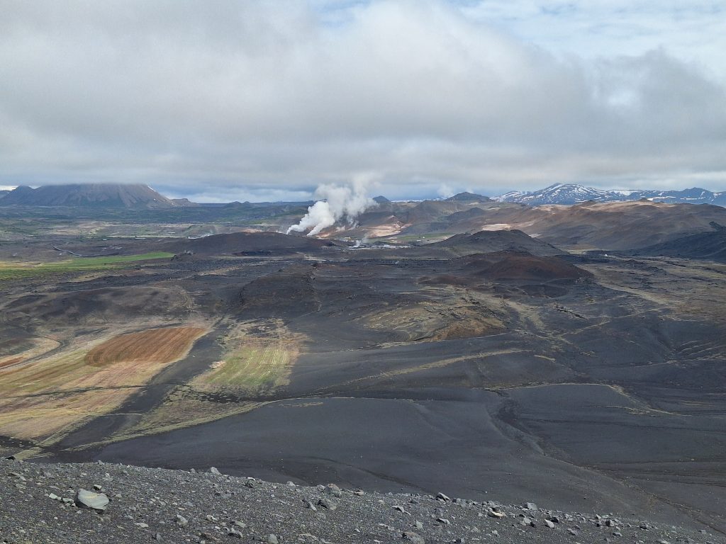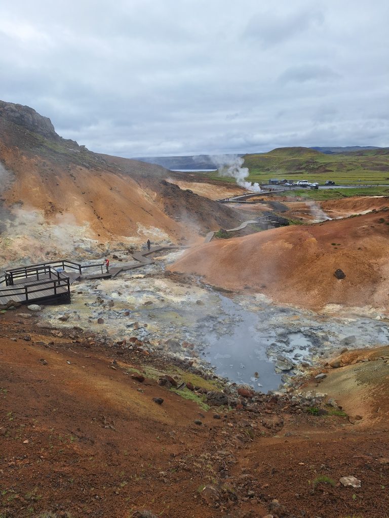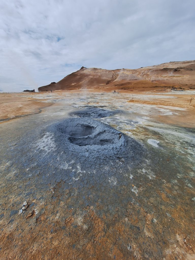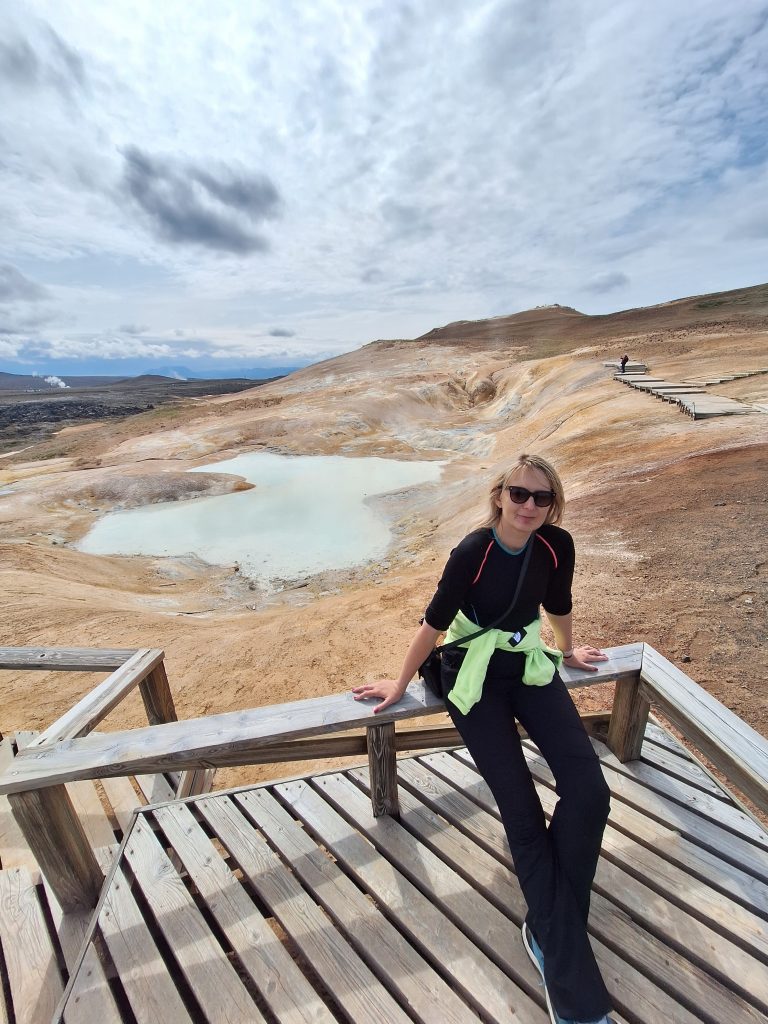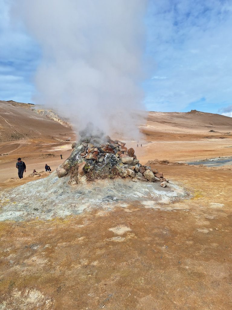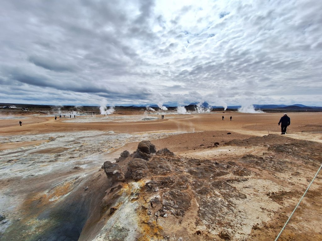 Tuż obok znajduje się obszar geotermalny Leirhnjúkur, jedno z moich ulubionych miejsc na Islandii niesamowite miejsce! Można spacerować po tym obszarze geotermalnym, a nawet wejść na szczyt wulkanu. Krajobraz wygląda jak na Księżycu albo na innej planecie. Widać wiele otworów wentylacyjnych, z których unosi się dym, a wiele skał jest ciepłych w dotyku. Niektóre zbiorniki wodne również bulgoczą, tworząc niesamowity krajobraz.